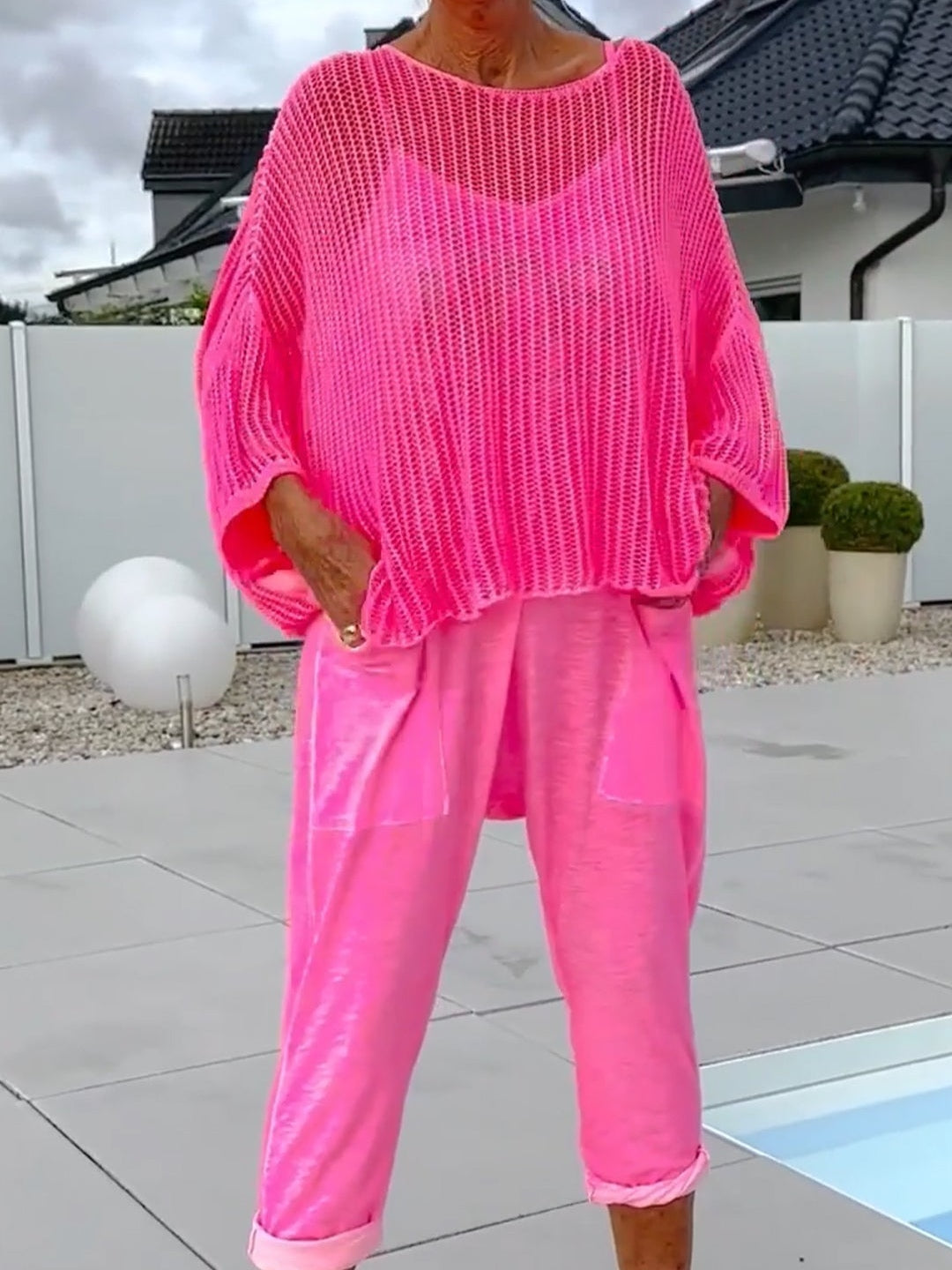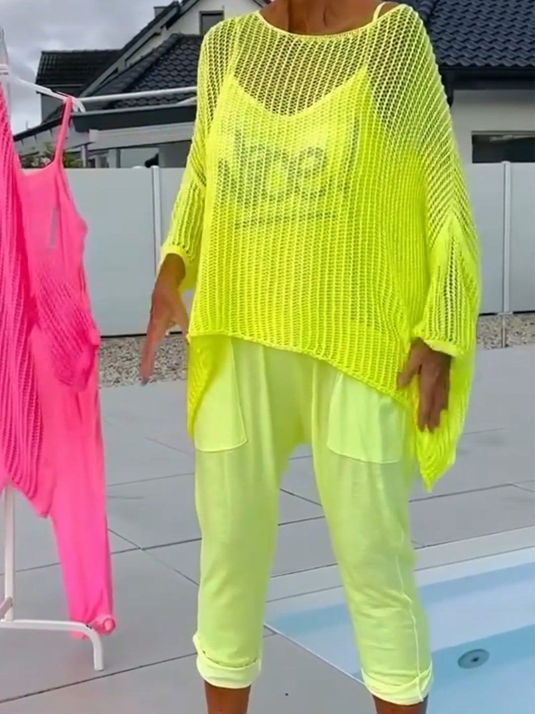 This jumpsuit features a smooth silhouette, clean lines, and a full of letter patterns, breaking the monotony and showing personality without losing the retro street style. The high waist design cleverly lengthens the leg proportions, visually creating a golden figure. The three-dimensional tailoring of the wide-leg pants corrects the defects of the legs and adds a lively atmosphere to every step. The hollow top is made of fine knit or light chiffon fabric, and the exquisite hollow pattern and perspective effect make the skin looming, adding a soft and romantic atmosphere to the overall shape. Whether it is draped over the shoulders or tied at the waist, it can easily create a layered look.